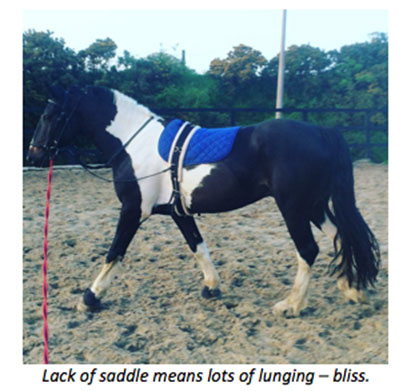 While obviously allowing as little exercise as possible is of paramount importance to the success of this plan, sometimes we have to give a little to get a little. So – she opens the door carrying treats, we are motionless. She opens the door carrying saddle, rapidly reverse in a circle away from her until she either falls over one of the banks in dizziness, gives up, or comes a little too close to your bottom for comfort. Treats, motionless. Saddle, piebald roman candle. Simples.